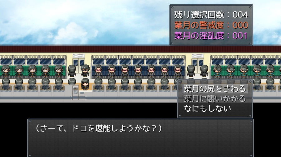 出社を選ぶと通勤シーンが入り、葉月に対して痴漢をすることができました。1日につき4回選択でき、するごとに警戒度が上がり、一方何をしないを選ぶと警戒度が下がります。最初は尻を触ることしかできないですが、繰りかえすことでできることが増えていきました。