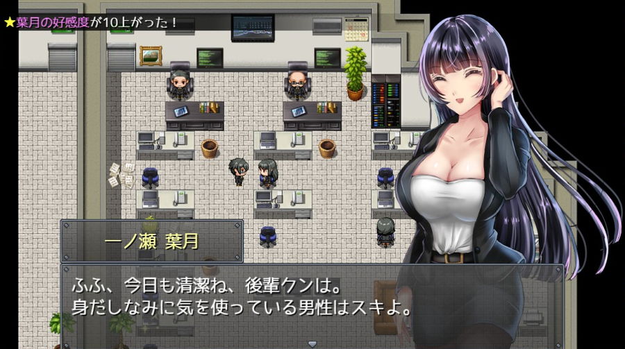 仕事をする前に先輩に話しかけると、(清潔な状態だと)好感度が上がります(純愛展開を狙う場合はこれが3日間必須)。