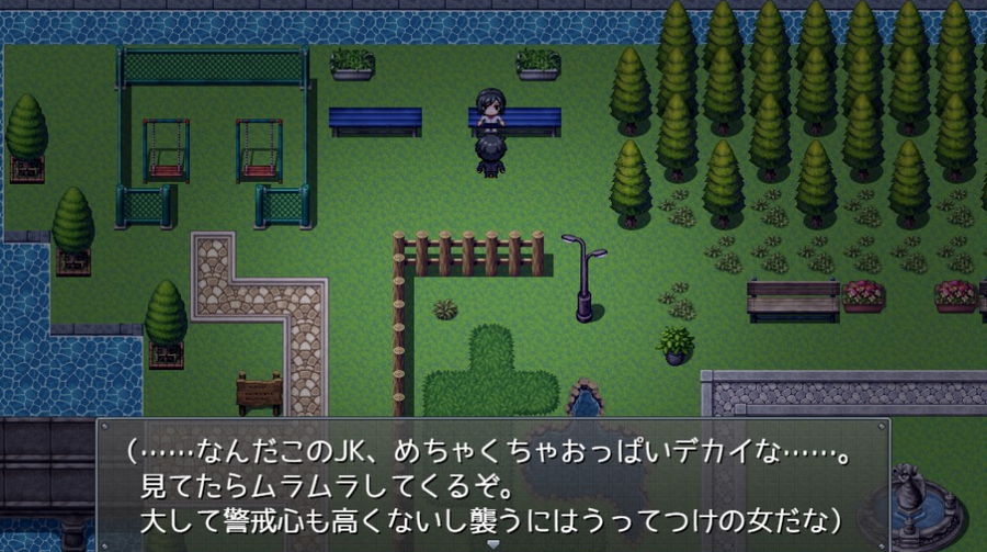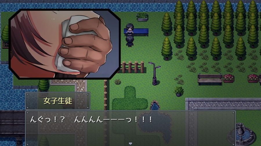夜の公園左上のベンチにいるJKに話しかけ、クロロホルムを使用します。効果は抜群で、あっという間に気を失ってしまい、雑木林に連れ込んでいつものように鬼畜にレイプです。これで体験版で見られるエロシーン4つが埋まりました(エロシーンなどは、タイトル画面のギャラリーで確認できます)。