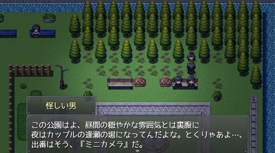 右寄りのベンチにはカップルやそれを覗く男がいました。覗き男に話しかけると、自宅PCで”ネット販売”コマンドが使えるようになります。