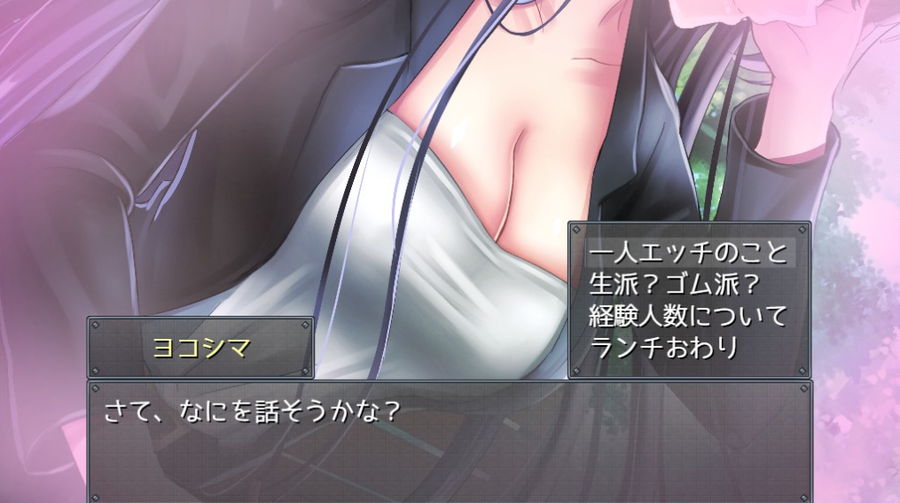 前日と同じようにランチに誘うと、前日と違って選択肢はエロ・セクハラ系のみで、どれも好感度-5と引き替えに情報を得られました。先輩の反応はいずれも初々しいもので、男性と付き合った経験は少ないようです。