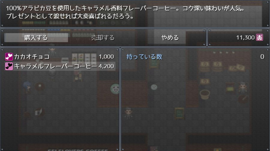 カフェでは”キャラメルフレーバーコーヒー”を購入できました。プレゼントですが、他と違って”アイテムを渡す”で渡すことはできず(デートイベントで必要になります)。