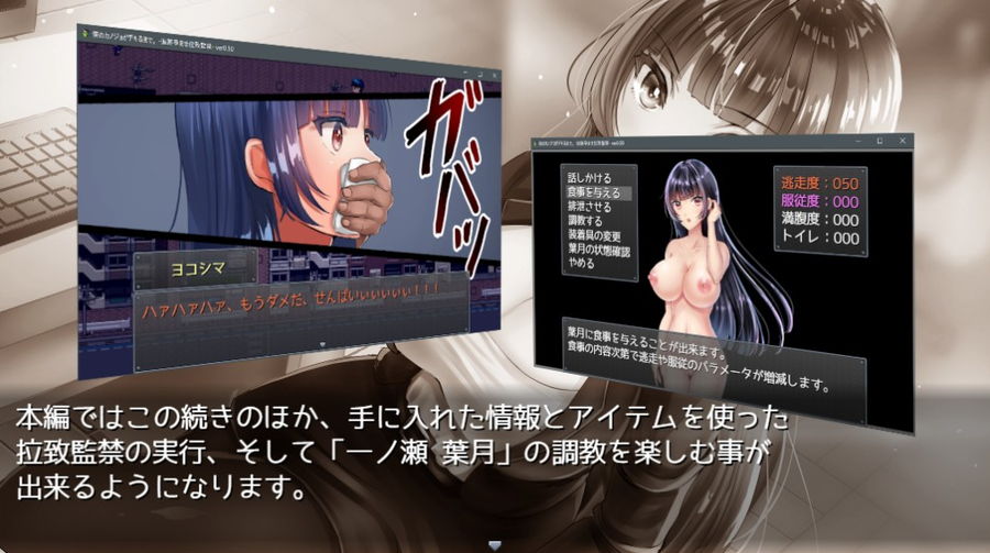 エロシーンは4つ見られ、電車内で葉月を無理矢理レイプ、準備不足で期間が終わり葉月を無理矢理レイプ、後輩を睡眠薬で眠らせてレイプ、公園のJKを眠らせてレイプ、と今回の体験版ではいずれも鬼畜系でした。誰かに見つかったらまずいという緊迫感がいい具合に出ており、CGもクオリティ高かったです。