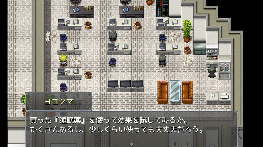 葉月以外のエロシーンもありました。まずは睡眠薬(コンビニで買える)での悪戯(いきなり葉月に使うのは失敗が怖いので、手頃な女でテスト)で、各所に色々女がいますが、社内のイヤミな女に対して使えました。コンビニで睡眠薬を購入後、社内右寄りの光っている箇所を調べます。