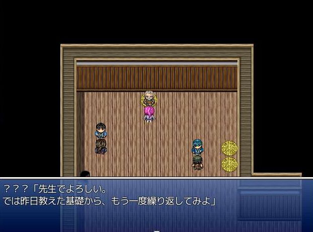 道場に戻った後、左に進むと話が進みます。回想らしきイベントが少し入ったあと、この道場をあとにして東へ旅立つ、というところで体験版のストーリーは終了です(引き続きプレイ可能)。