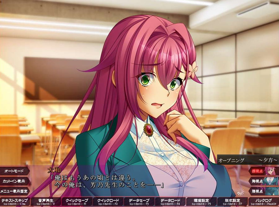 放課後の教室で芳野先生をどう犯そうか作戦を練り、行為中に他人に見られる事態だけは避けたいと考えを巡らせ、下校時間間際がいいという結論に達しました。そうこうしていると新たな女教師から声をかけられ、日本史教師の御小柴朱梨です。自分の授業を休んで保健室に行った主人公のことを心配してくれたあと、不良学生な主人公を自分が更生させると自信満々に熱意を燃やしてきました。主人公は無難に会話を切り抜けつつ、内心ではいつか自分のものにしてやると誓います。