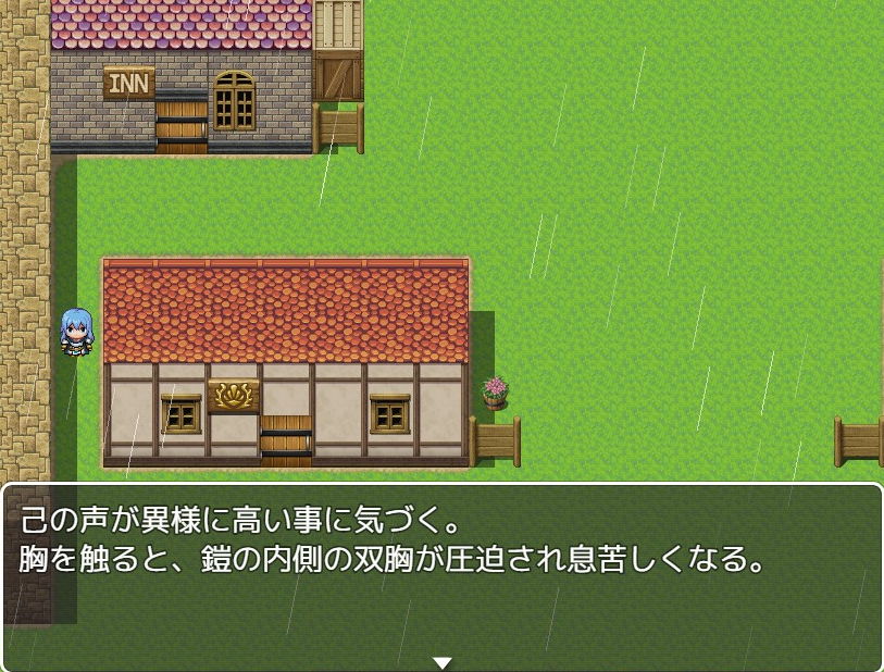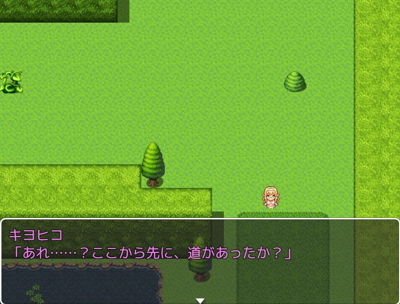 気がつくと主人公は金髪女エルフの姿になっていて、ペニスも消滅していました。体を観察した主人公は、自分の体と金髪エルフの体が入れ替わってしまったと判断し、元の自分の姿を探しますが近くには見当たらず。外に出ると話が進みまして、左下へ進むか、まっすぐ下に進むかでルートが分岐しました。進む前にセーブしておくと時間短縮になります。