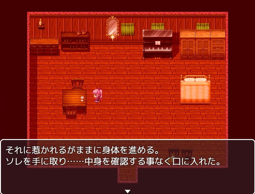 部屋の色々な物が調べられて探索に少々苦労しましたが、棚の右端を調べると”発情対策薬”が手に入りました。
