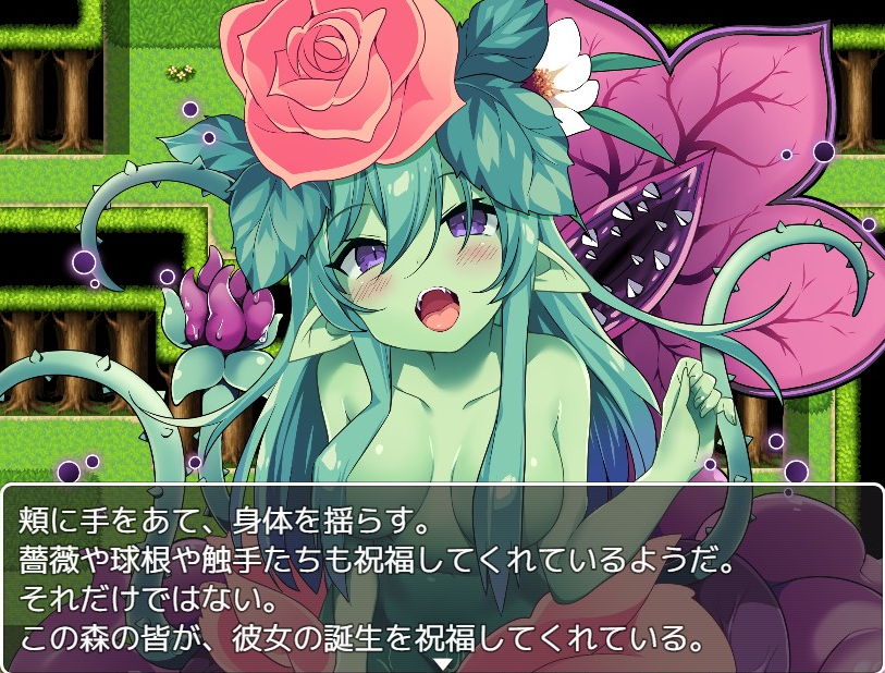 頭に植え付けられた種はあっという間に主人公の体を変化させ、数歩歩くと全身がアルラウネ化してしまいました。攻撃は1発でも食らってしまうとダメなようです。