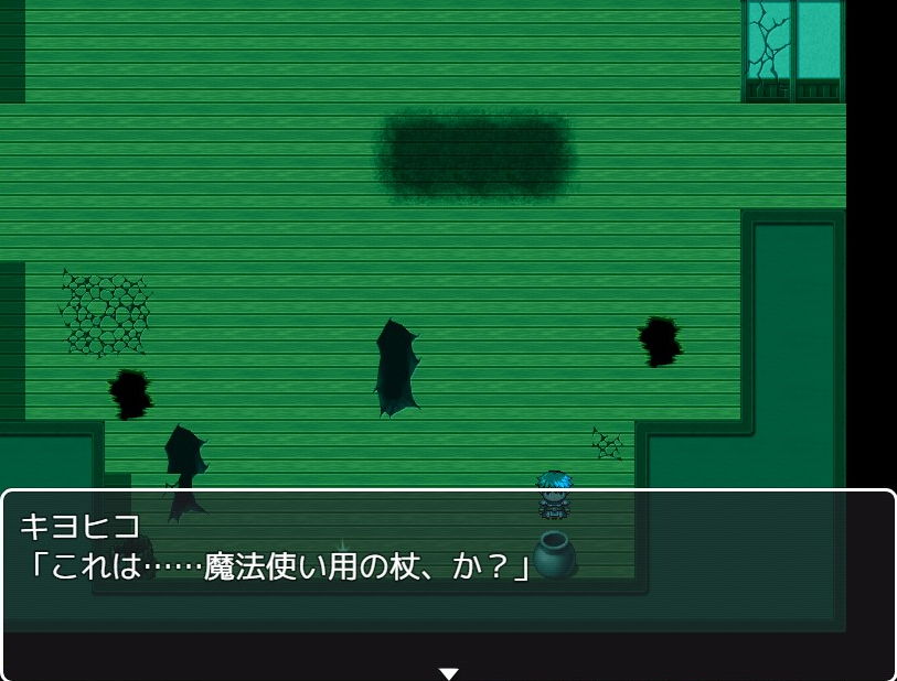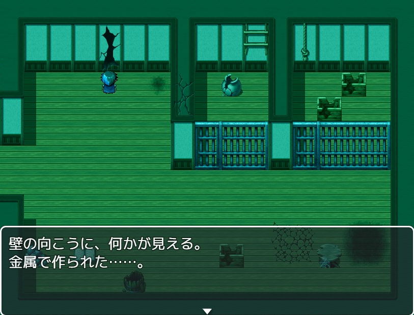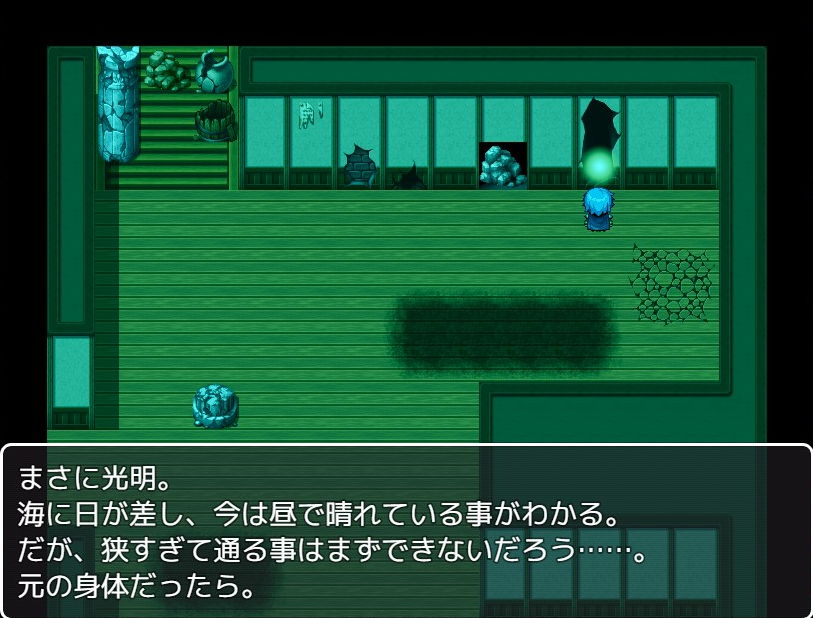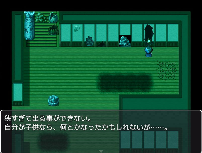 息ができるとはいえいつまで続くかわからず、船からの脱出を図ります。脱出法ですが、まずは部屋から出て右下にある壺から杖を入手します。これは右の部屋の穴で必要になりました。なおマップ移動で体が少しずつ変化していきましたので、無駄に行ったり来たりしないよう注意です。なお変化はいずれも画面切り替え・移動時に発生しました。放置状態や歩いていて突然変化することはなかったので、時間や歩数は関係なさそうです。