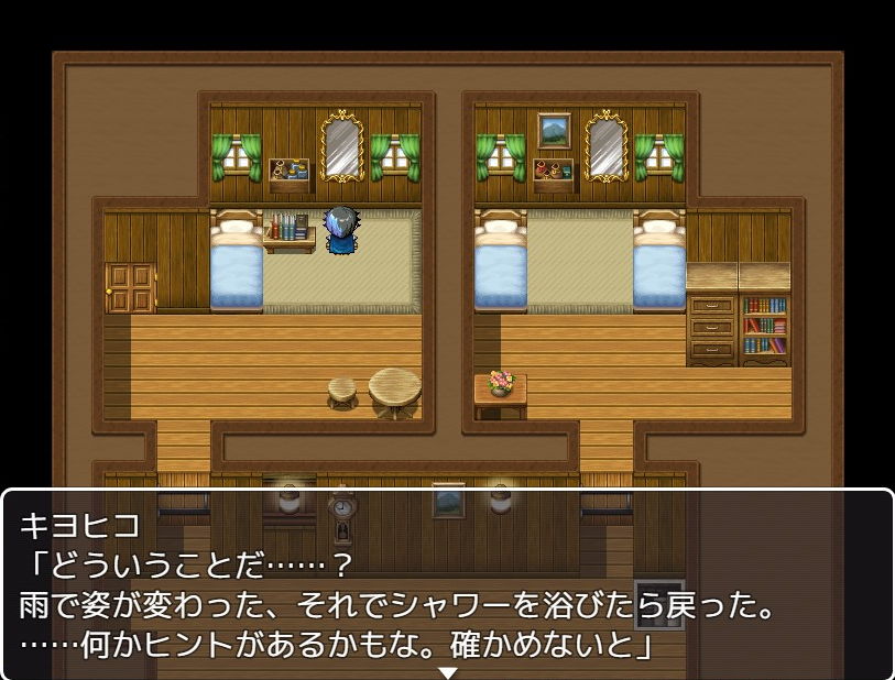 もう元の体に戻れないかと思いましたが、部屋に戻ってシャワー(=温かい水)を浴びると男の姿に戻っていました。どうやら水や雨を浴びることで女になったり男に戻ったりすると推測したところでエンドです(このエンドは一枚絵なし)。