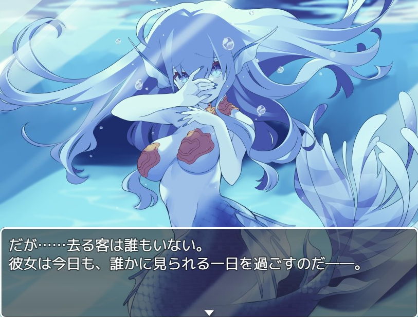 変化五段階目では完全に人魚化してしまい、脱出したとしてもこの体では地上で生活するのは無理だと悟ります。脱出後、人魚達の女王となり、歌うことで人魚の仲間を増やすというレズ系エンドでした。各種エンドはおまけ部屋で確認できまして(それぞれヒント表示・開放ができます)、体験版で見られるエンドはこれで全部のようです。