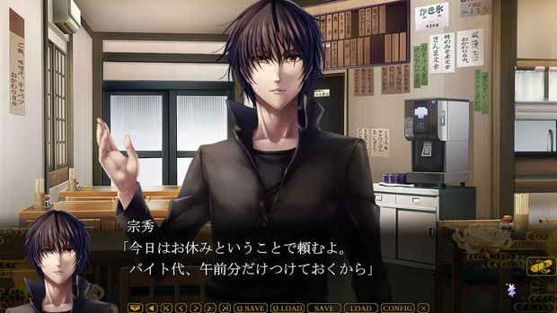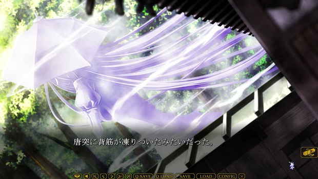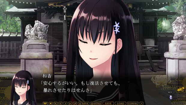 ここで新キャラが登場し、学園に通っていた時の先輩でした(主人公が一方的に知っている)。神社に用事があるようで、祖父が亡くなり叔母は海外なので自分が承る旨を説明します。詳しいところは後ほど明らかになりましたが、退魔士・神職系なキャラでした。和香様と琉々葉様の説明に難儀するものの、うまいことごまかします。