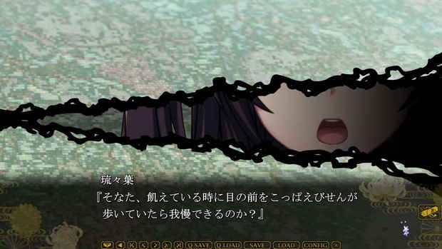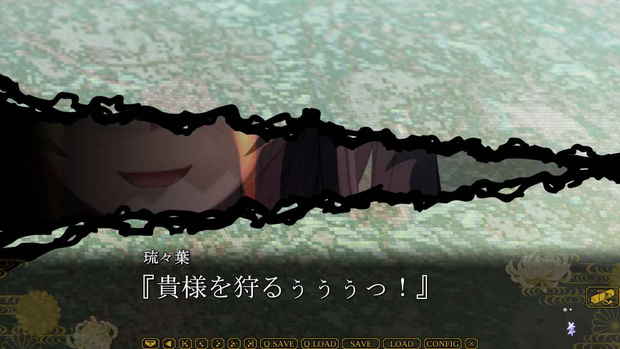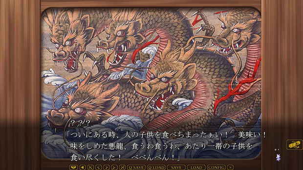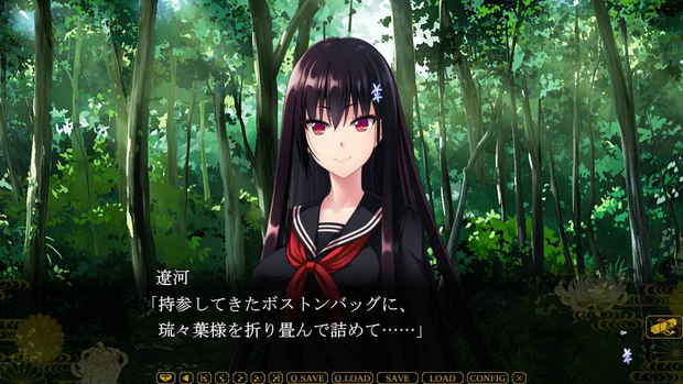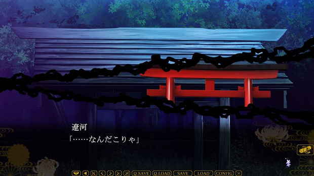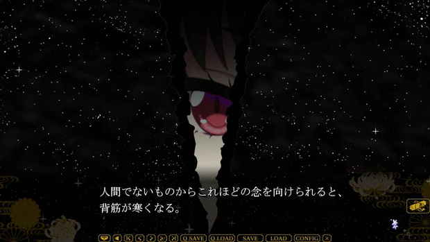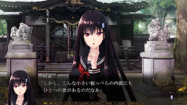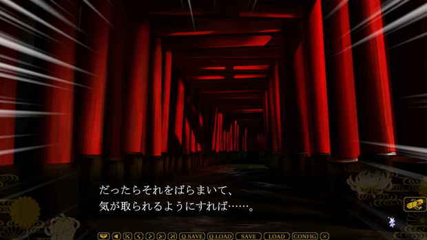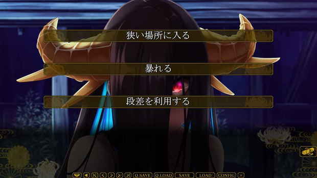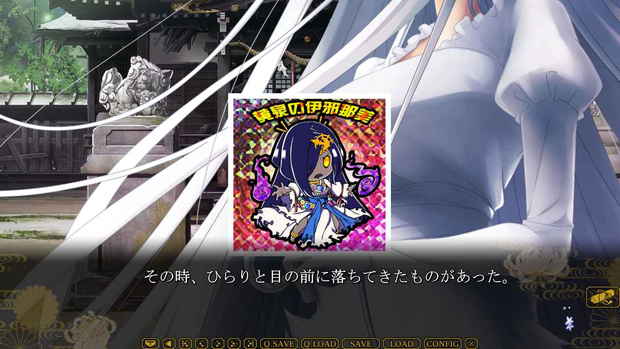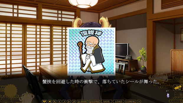 とどまった場合、女に背後を取られてしまい、そのままどこかへ連れ去られてゲームオーバーです(タイトル画面に戻る)。ただこれを見ることでシール”黄泉の伊邪那美”が得られ、全く無意味というわけではありませんでした。シールの収集状況は画面右下の”ふることぶみ”で見られ、体験版の場合、枠は全部で13つです。