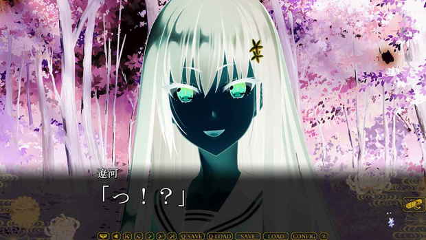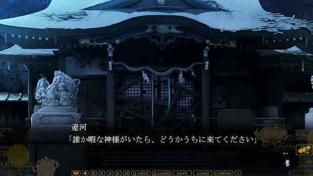 終わって神社に戻ると、不気味なほどに真っ白な人間?を発見し、一気に緊迫感ある雰囲気に変わります。逃げるかとどまるかの選択肢が出まして、間違えるとゲームオーバーなので選ぶ前にセーブ推奨です。
