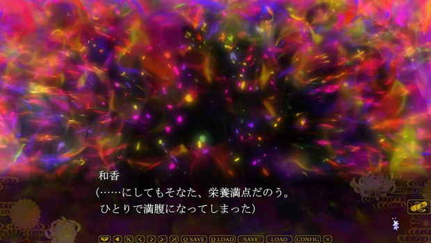 戦うか受け入れるかの選択肢で、ここはゲームオーバーありです。受け入れるを選ぶと、シール”鹽盈珠(しおみつたま)”を入手したあと、女に吸収されることを選びます。食われるというよりは同化で、主人公の意識はそのまま残り、不思議な世界観でした(ゲームオーバーで、タイトル画面に戻る)。