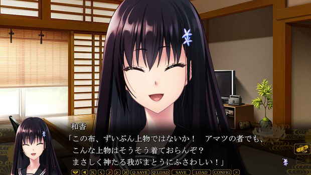 エロシーンは大容量体験版で見られ、お風呂の世話をするシーンからいい雰囲気になり、本番まで一気に行く様子が見られました。雰囲気としてはキスシーンがたっぷりあるなど純愛系で、和香様がほどよくリードしてくれる様子がいい関係でした。なおテキストの分量で言いますと(体験版の範囲では)非エロなシーンの方が圧倒的に多く(95%以上がエロ以外なシーン)、エロよりも神様・物の怪絡みがメインな作品という印象でした。